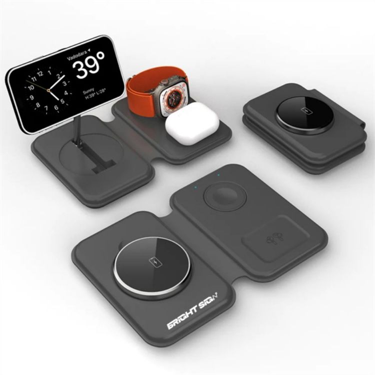 A foldable 3-in-1 magnetic charger designed for travelers and commuters who need compact, reliable power. Fold flat to pack, then unfold to reveal magnetic zones that secure a smartphone, earbuds, and a watch for fast wireless charging. The adjustable viewing angle supports hands-free streaming or video conferencing on the go. Ideal for business travelers, digital nomads, and students living in shared accommodations.